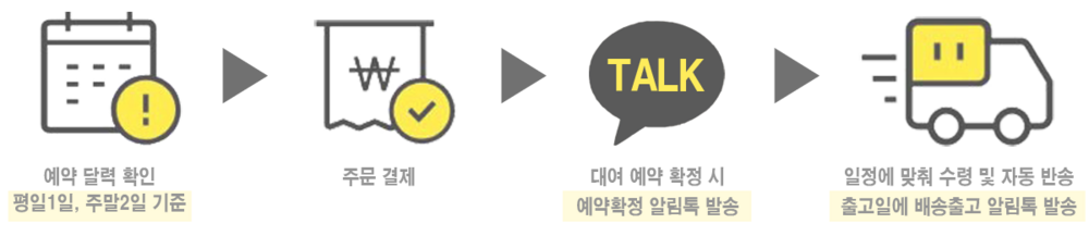 주문 확인 후 대여 일정이 안내된 ①예약확정 카톡알림 을 드리며, 발송일에 운송장 번호가 첨부된 ②배송출고 카톡알림 을 드립니다.